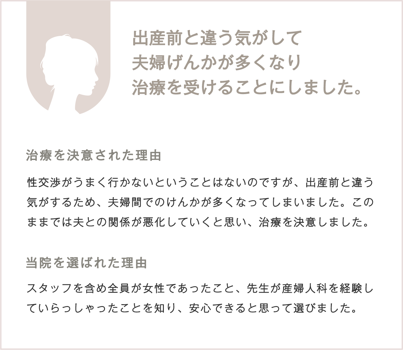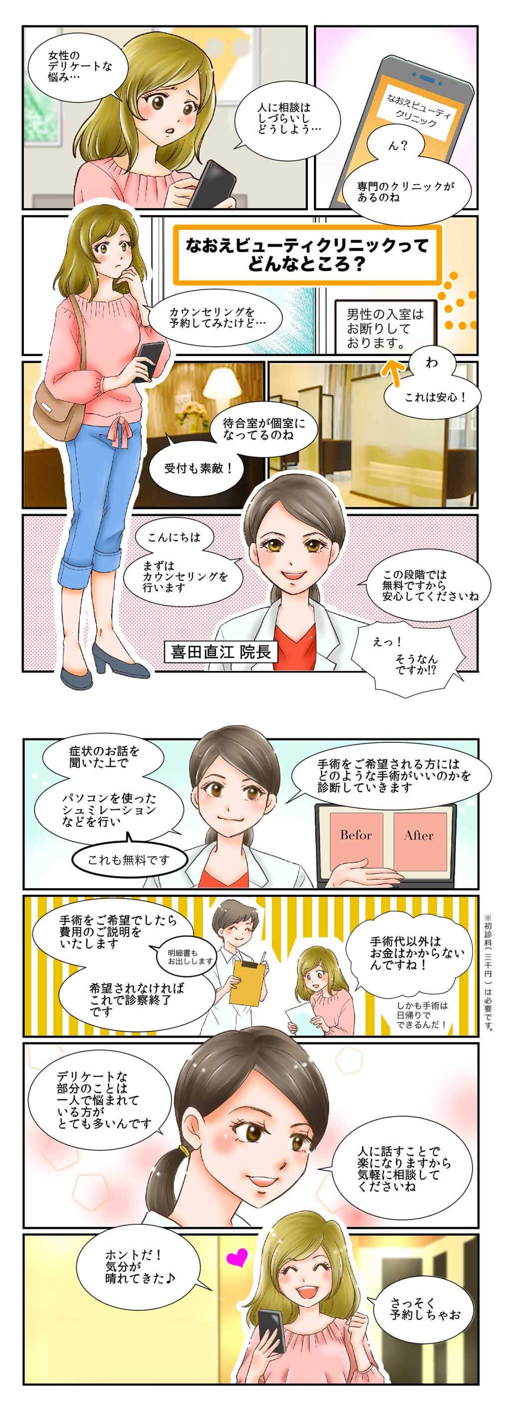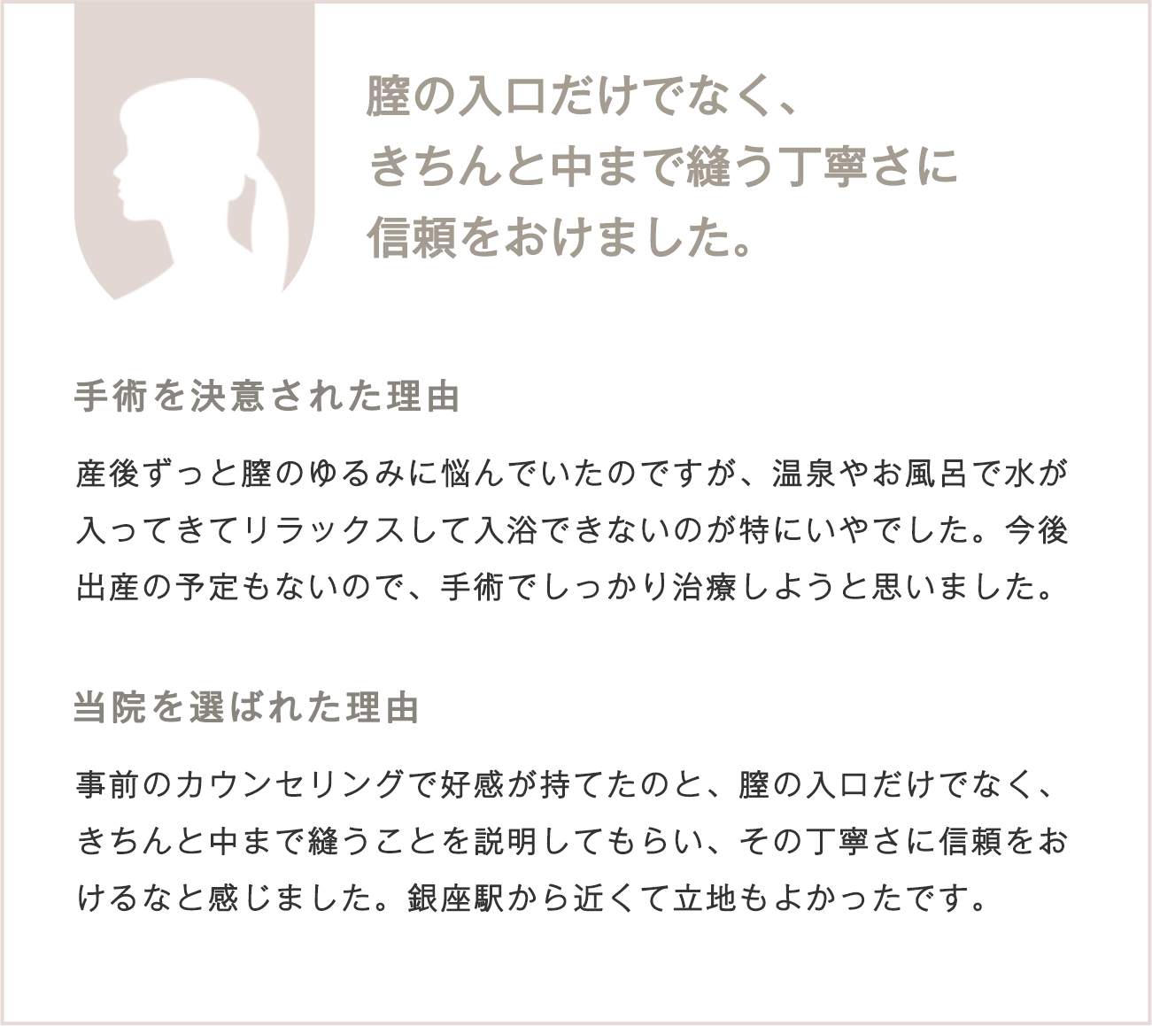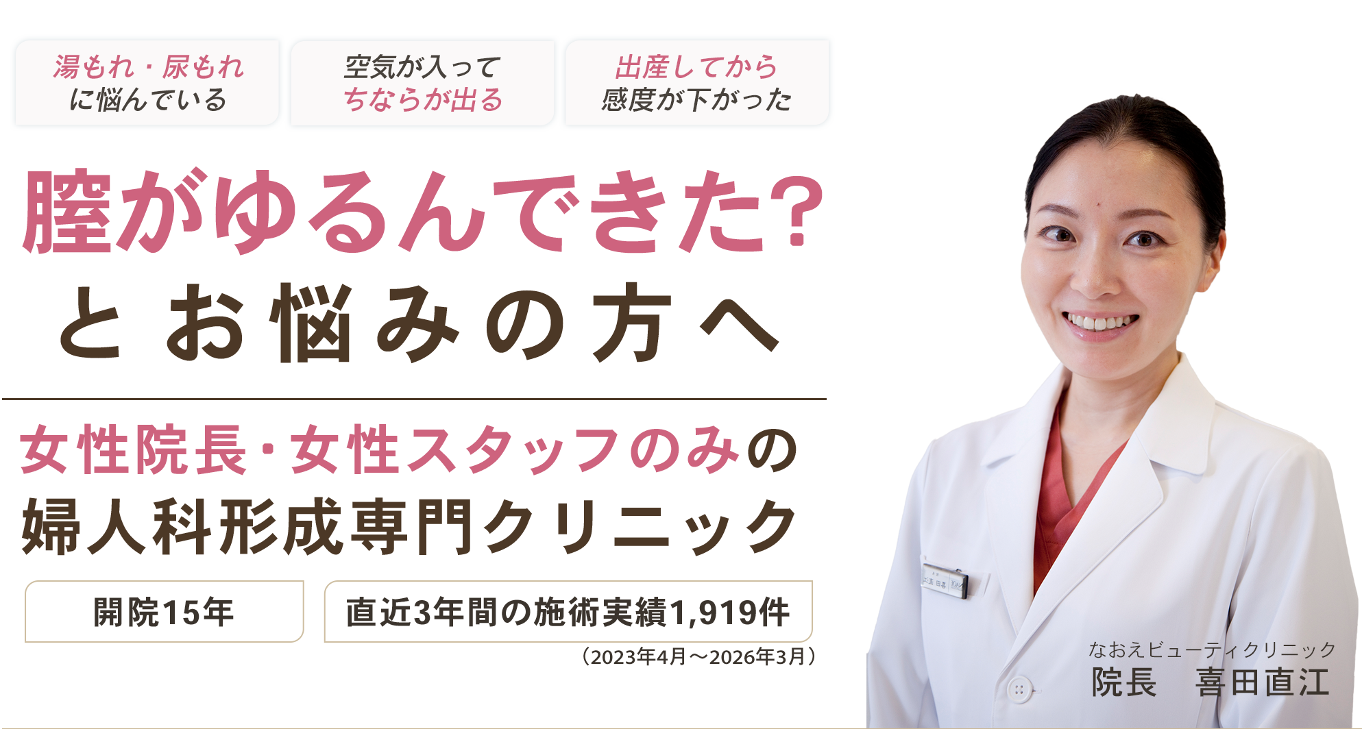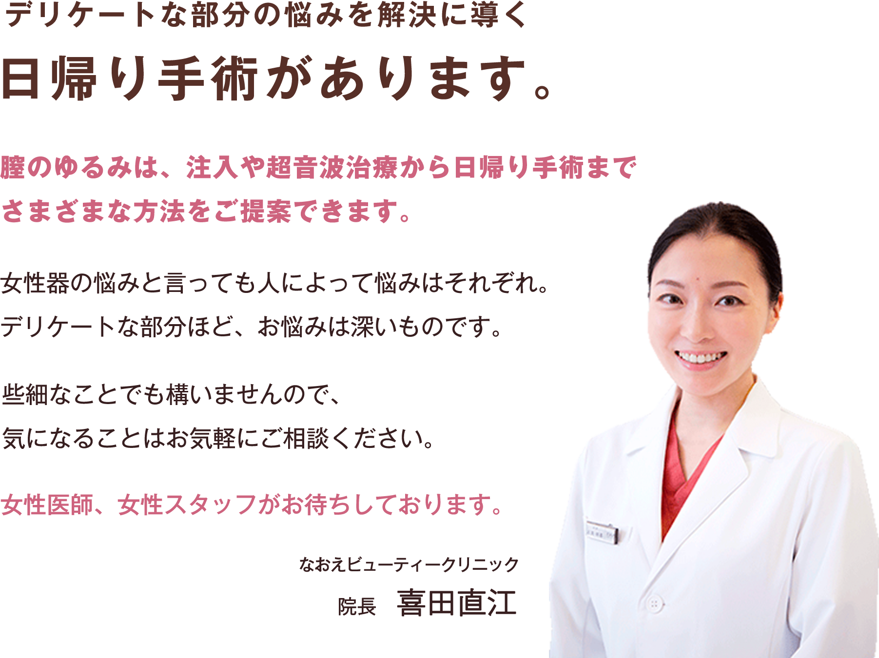 婦人科の豊富な知識女性器は体の中でも特に神経や血管が豊富な部位です。十分な解剖学的知識と経験がなければ、手術後に後遺症を残してしまうこともあります。喜田直江院長は、婦人科医としての知識を活かした施術をご提供できます。